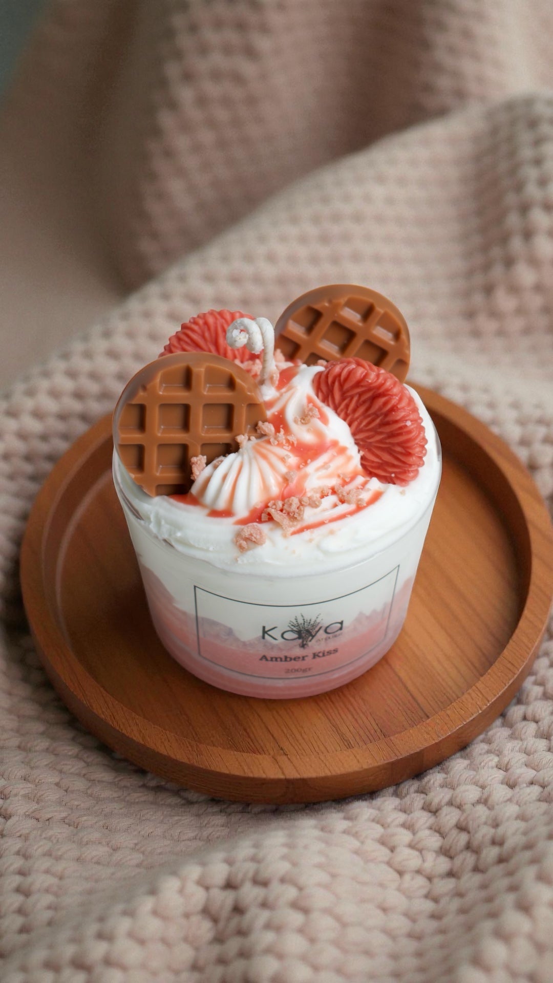 Φυτικό κερί σόγιας με άρωμα Amber Kiss — ένα ζεστό, αισθησιακό άρωμα που αγκαλιάζει τον χώρο με νότες κεχριμπαριού, βανίλιας και απαλής μόσχου. Μια μεθυστική ισορροπία γλυκύτητας και βάθους, που αποπνέει κομψότητα και ρομαντισμό.