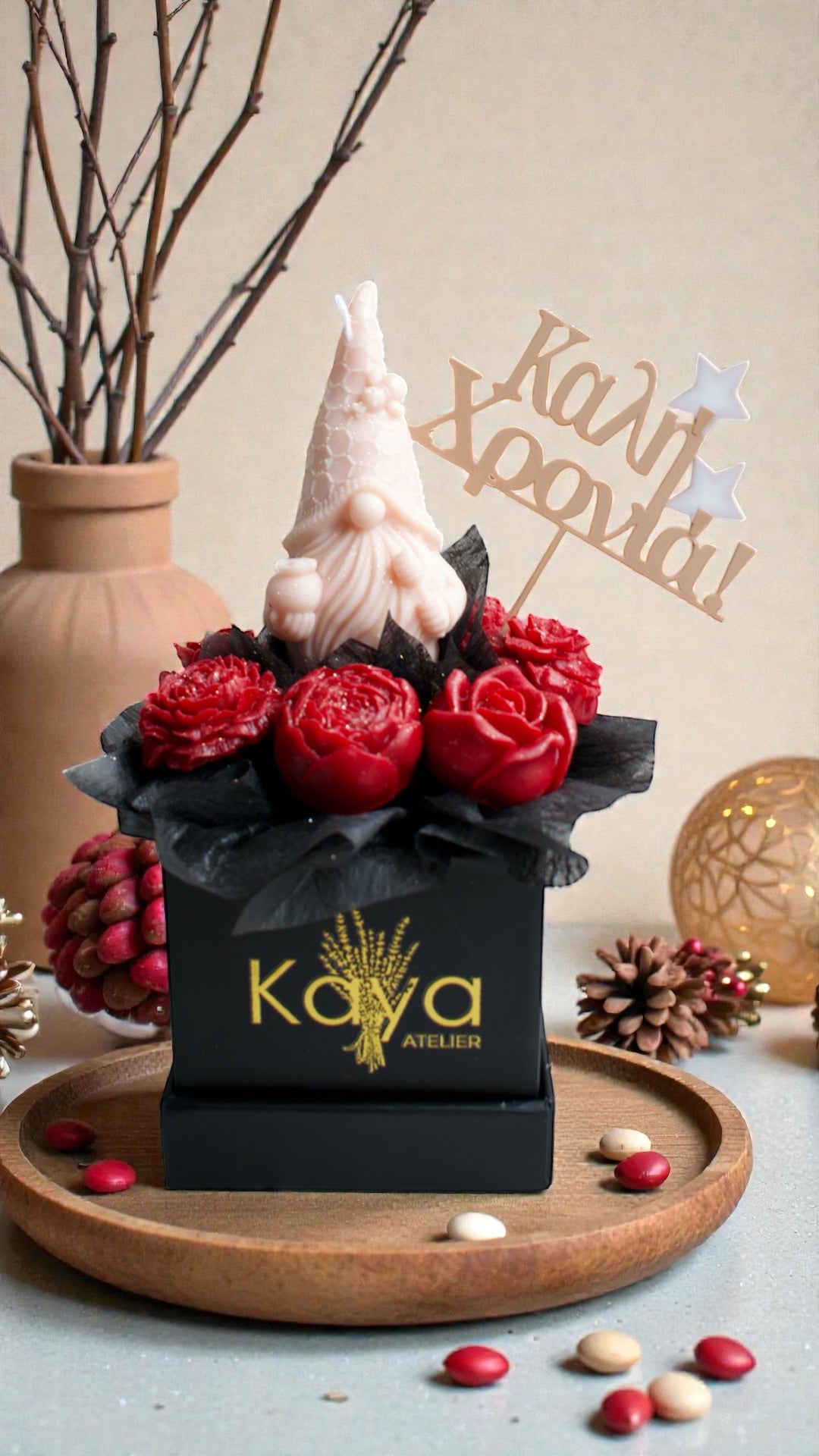 Μία μοναδική χριστουγεννιάτικη σύνθεση λουλουδιών από φυτικό κερί σόγιας σε χάρτινο κουτί ,φτιαγμένη με πολλή αγάπη και μεράκι!