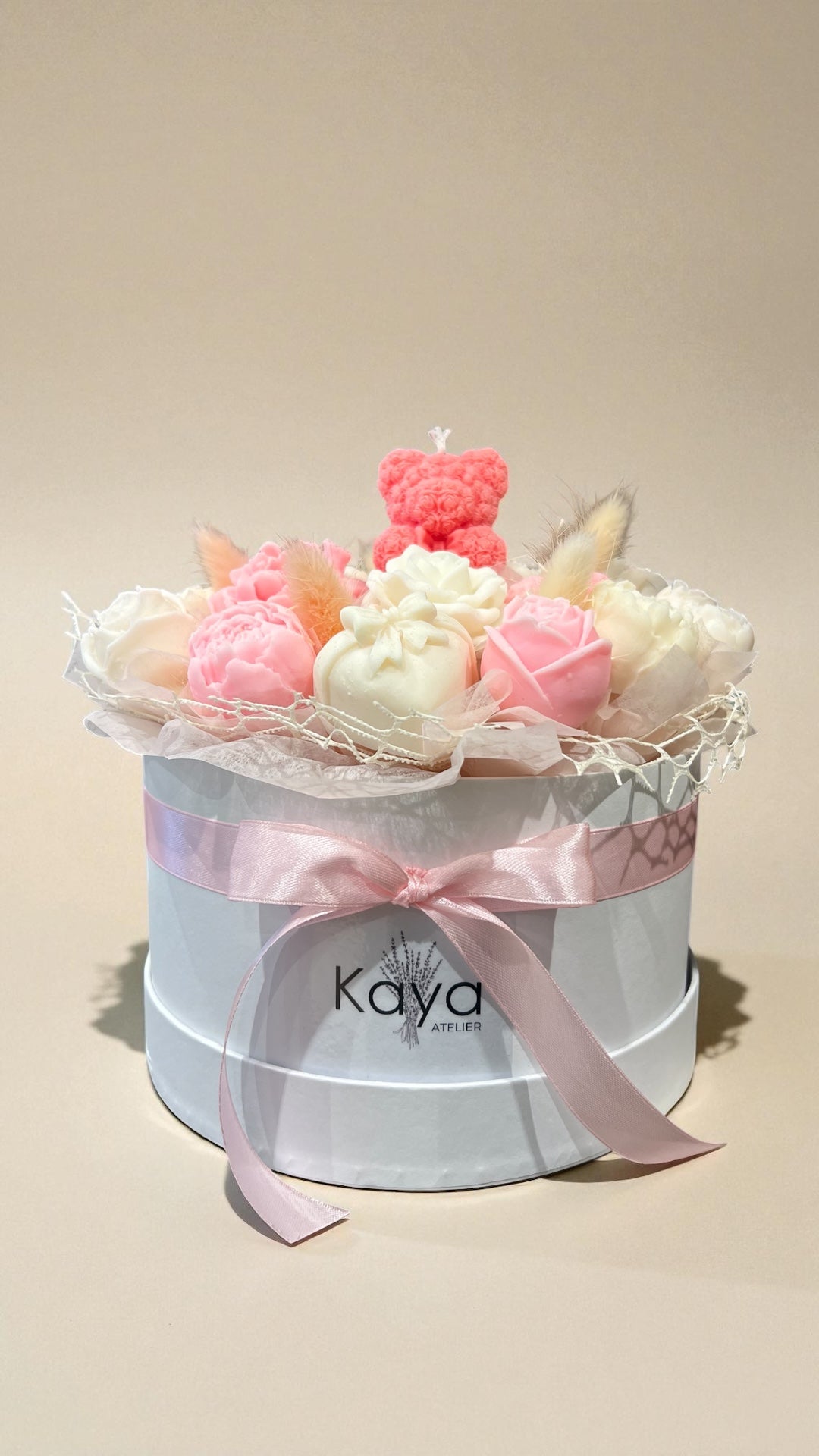 Μία μοναδική σύνθεση λουλουδιών από φυτικό κερί σόγιας σε χάρτινο λευκό κουτί ,φτιαγμένη με πολλή αγάπη και μεράκι!