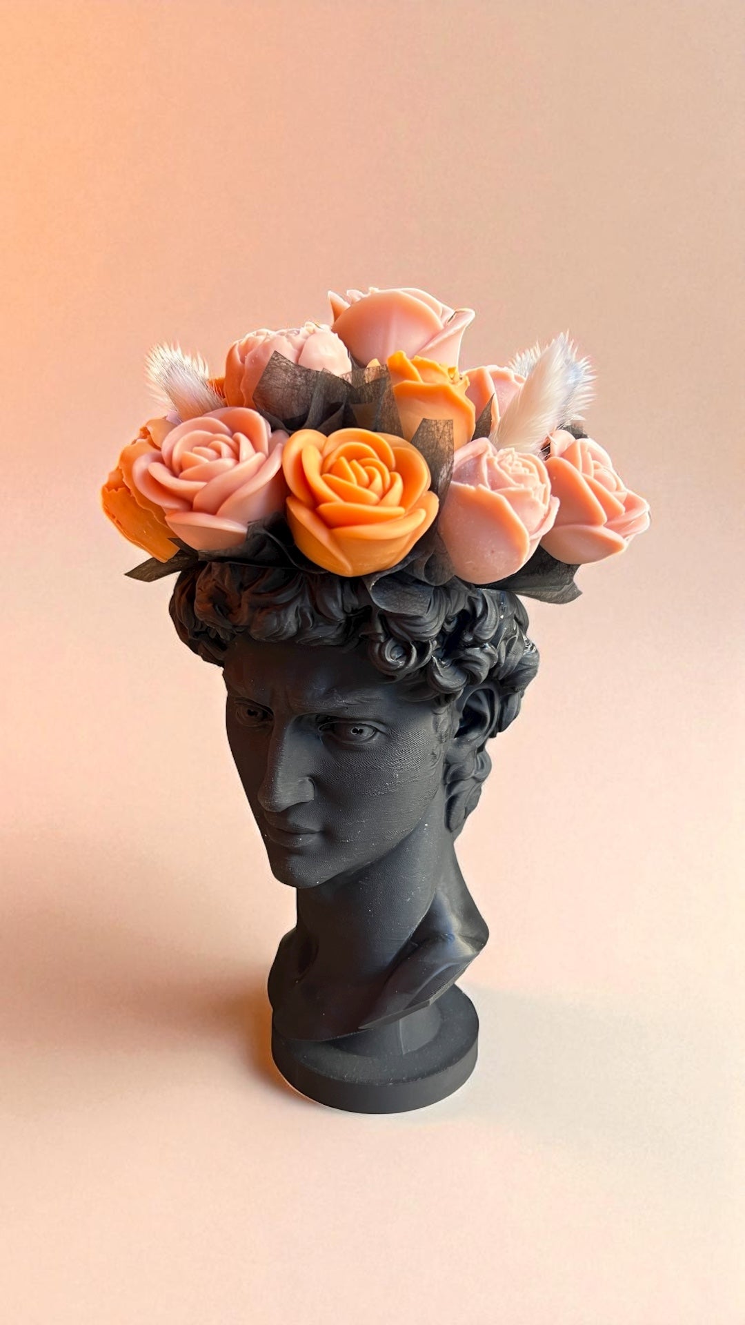 Ο Δαβίδ παρουσιάζεται με ένα μοναδικό στολισμό από αρωματικά λουλούδια, συνδυάζοντας την κλασική τέχνη με τη σύγχρονη αισθητική. Η προσεγμένη ανθοσύνθεση σε γήινους και απαλά ρομαντικούς τόνους χαρίζει κομψότητα και φρεσκάδα.